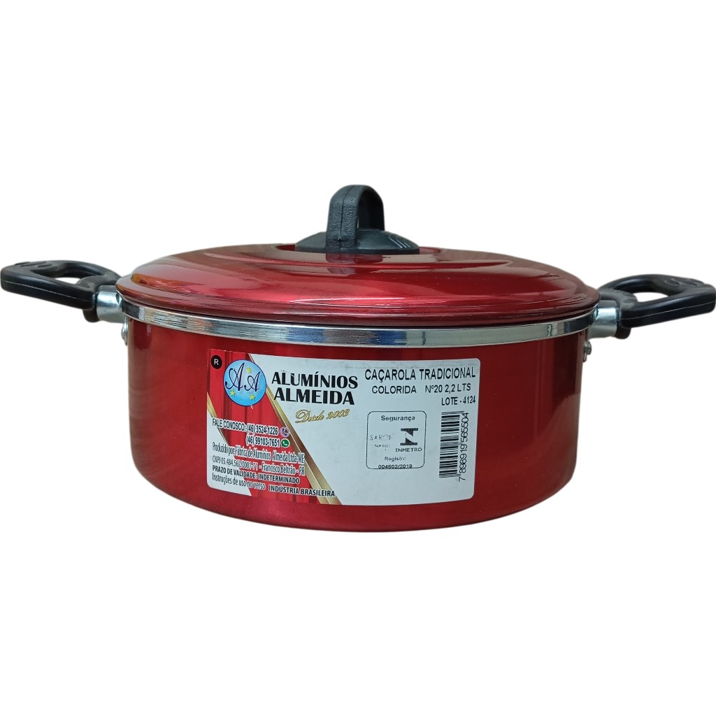 A Caçarola Tradicional Colorida Nº 20 em alumínio é ideal para o preparo de porções maiores com praticidade e eficiência no dia a dia.