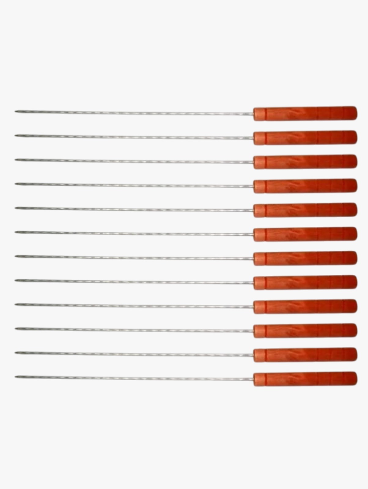 O kit acompanha 12 espetos, sendo uma ótima opção para churrascos em família, eventos ou uso profissional.