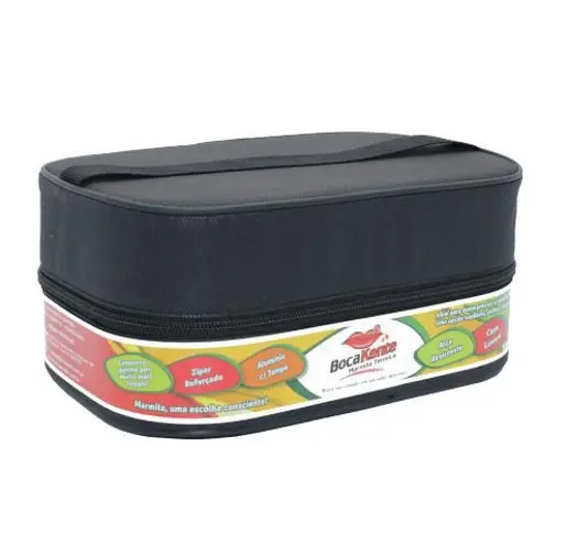 Seu formato retangular facilita a organização dos alimentos dentro do recipiente, enquanto a tampa e a capa com zíper garantem melhor proteção durante o transporte. O produto também possui alça reforçada que proporciona mais conforto e segurança ao carregar a marmita.