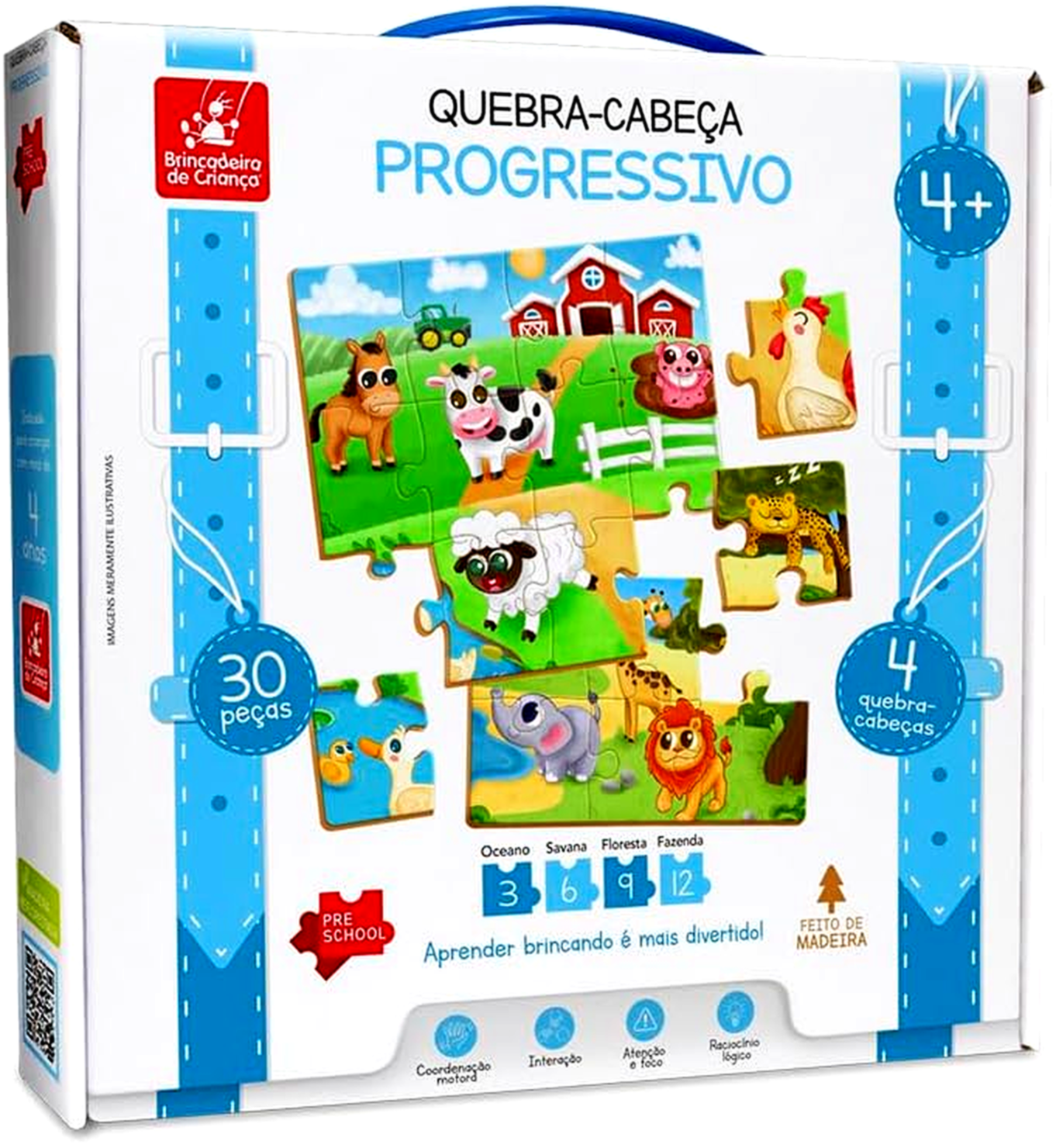 O quebra-cabeça progressivo da Brincadeira de Criança é ideal para acompanhar o desenvolvimento infantil de forma divertida e educativa. Com diferentes níveis de dificuldade, permite que a criança evolua gradualmente, estimulando o raciocínio lógico e a concentração. As peças são de fácil encaixe e adequadas para o manuseio dos pequenos, garantindo uma experiência segura e envolvente. Perfeito para uso em casa ou na escola, auxilia no desenvolvimento da coordenação motora e percepção visual. Produzido com material resistente, é uma excelente opção para aprendizado lúdico.